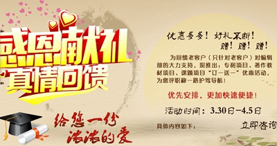 4月即将到来,为回馈老客户(只针对老客户的)对教材著作项目的支持,亿百出版网现推出:“订一送一”活动,凡定独著/全包作者,均可赠国际英文期刊一篇,独立署名加分权重更高更有说服力!另外定第一作者/主编 可赠第一副主编一个;二作者/主编 可赠参编一个;活动时间3月29日-4月5日。